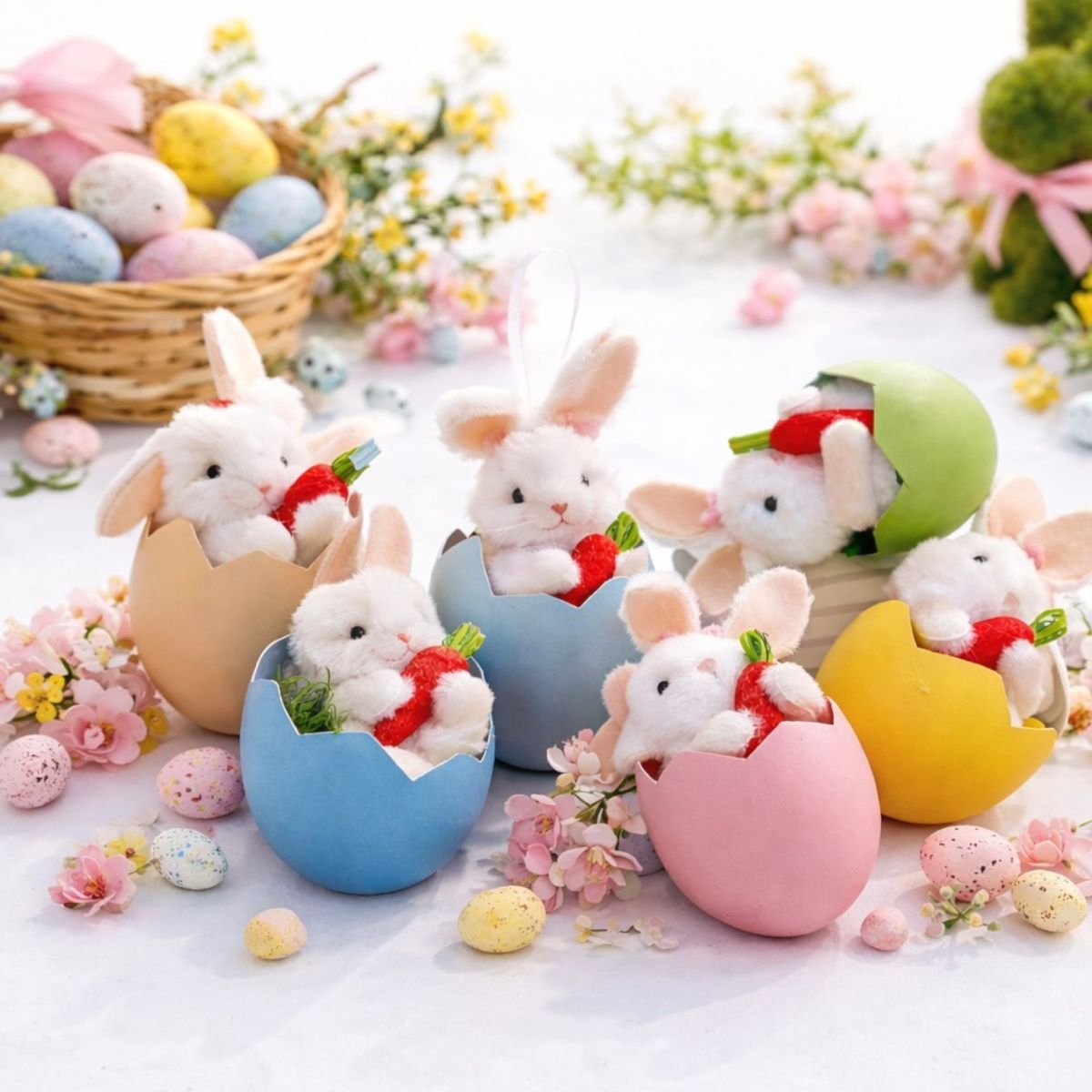 Produsul are o dimensiune de aproximativ 11 cm și este conceput sub forma unui iepuraș pufos care stă într-o jumătate de ou decorativ din plastic colorat. Iepurașul este realizat din material textil moale, plăcut la atingere, având un aspect delicat și prietenos. Acesta ține în brațe un morcov decorativ, element simbolic asociat cu iepurașul de Paște, care completează perfect designul produsului. Detaliile sunt atent realizate, iar expresia simpatică a iepurașului transformă această decorațiune într-un element decorativ deosebit.