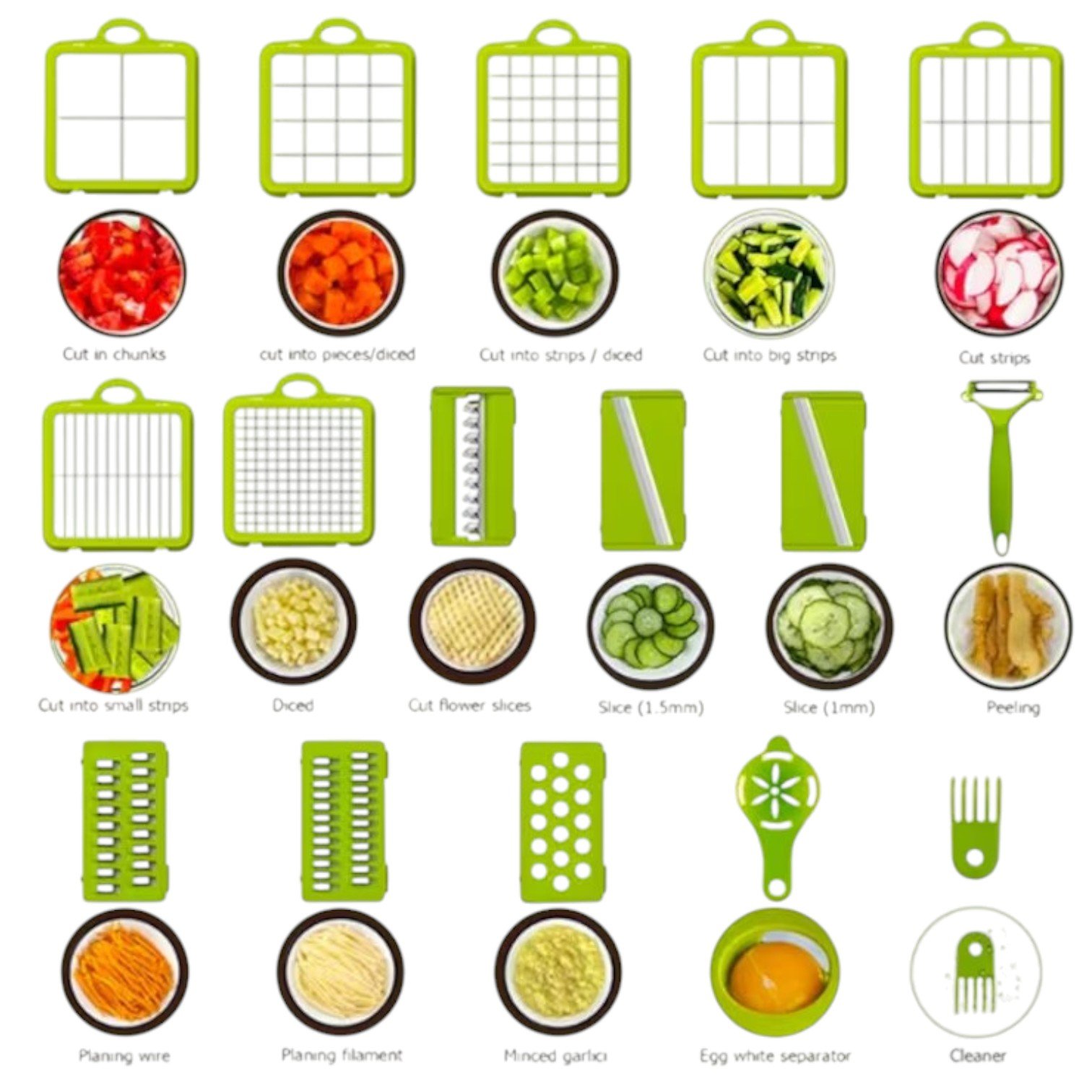 Răzătoare Multifuncțională 22 de Piese pentru Legume și Fructe, cu Funcție de Caserolă, Lame din Oțel Inoxidabil și Mâner de Protecție – Verde – Engros